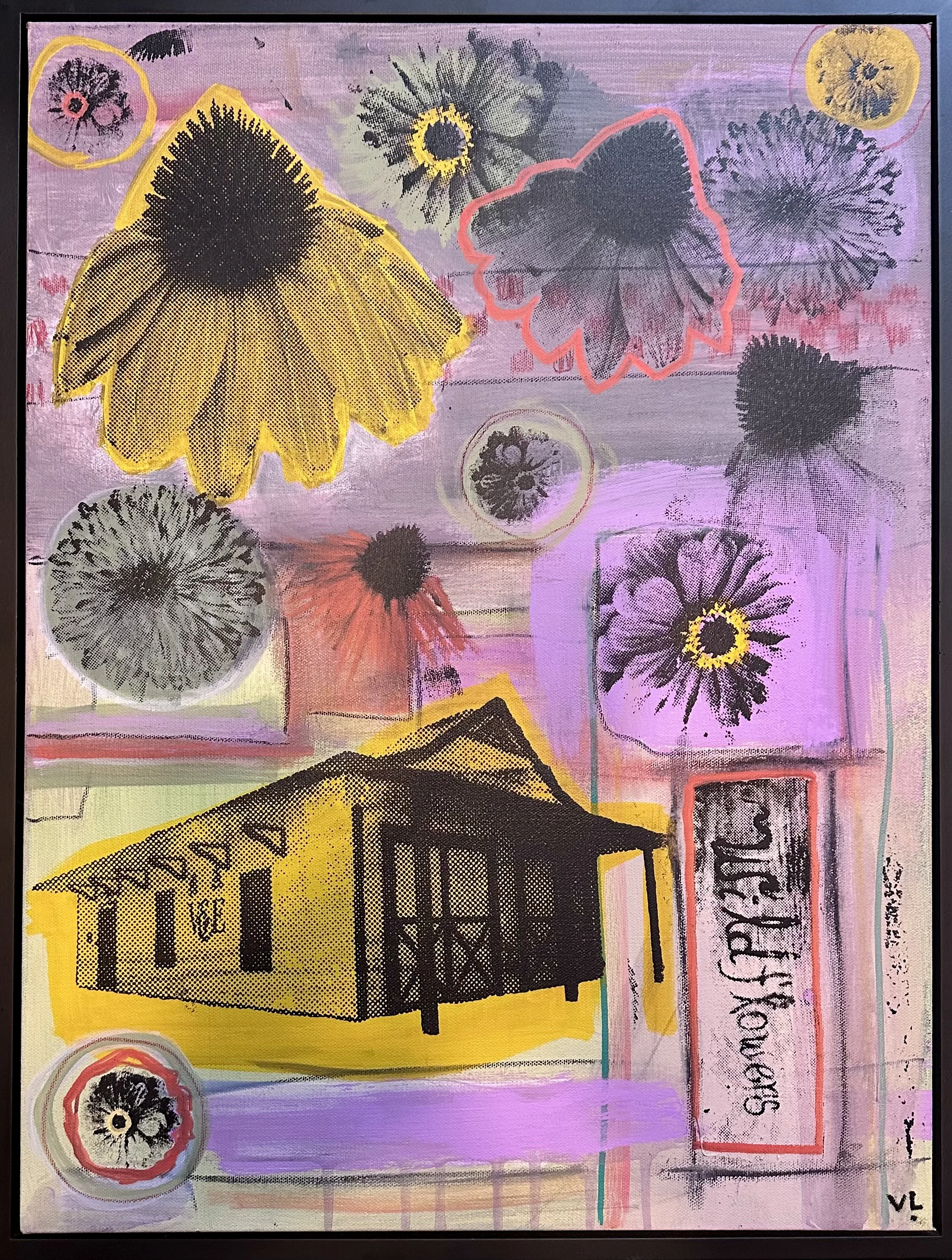This striking 18x24 mixed media canvas by Memphis artist Vince Long (VL Print) is a layered celebration of the V&E Greenline’s spirit. Bold hand-painted acrylics create a vibrant foundation of lavender, gold, and earthy tones, while aerosol textures and water-based screen printing add depth and rhythm across the surface. At the center, oversized blossoms—sunflowers, coneflowers, and other wild blooms—radiate with luminous color, their forms outlined in vivid strokes that echo the Greenline’s natural abundance.